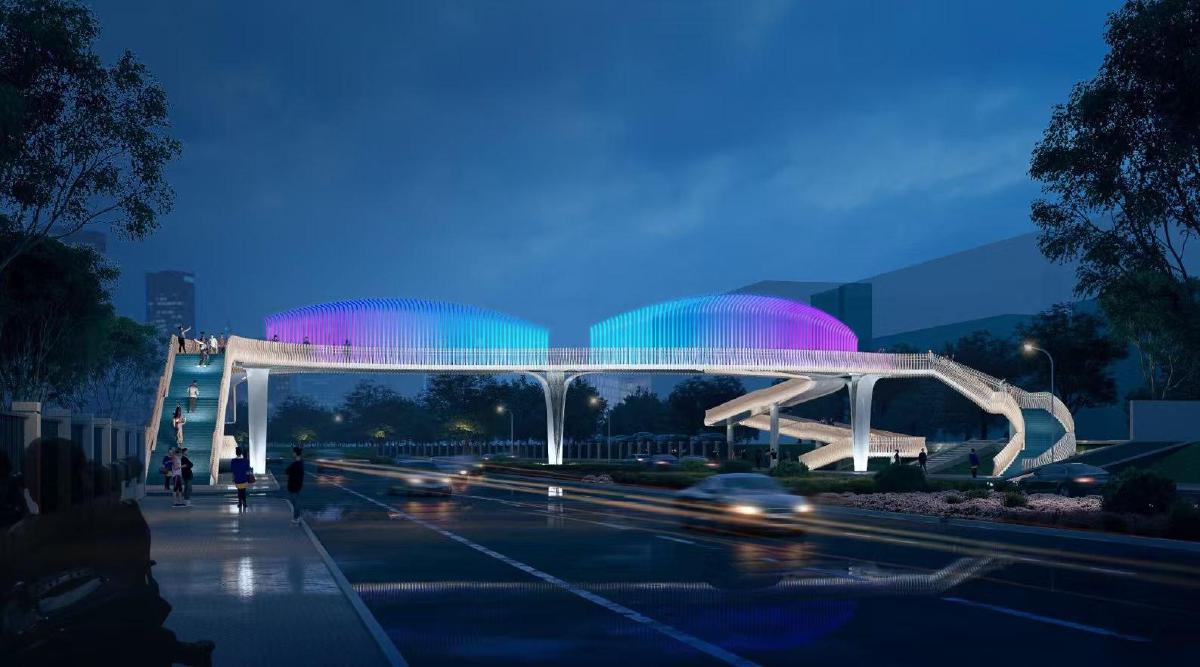 據(jù)了解,該人行天橋平面布置主要結(jié)合現(xiàn)場(chǎng)環(huán)境條件,因地制宜,主橋呈S型,理工校醫(yī)院側(cè)梯道呈C型,坡道采用設(shè)置轉(zhuǎn)向平臺(tái)的方式,在滿足天橋通行需求前提下,減少對(duì)既有人行道的占用;人行欄桿以“外掛”的方式附著于橋梁兩側(cè),立面采用獨(dú)特造型,橋面中心設(shè)置變高圓管格柵加以點(diǎn)綴;踏步照明區(qū)域以功能照明為主,橋面通過單色靜態(tài)光,自下而上投光形式,整體以自然內(nèi)透為主,避免過度照明;橋墩設(shè)計(jì)參照毛筆筆架,表面真石漆涂裝,外側(cè)鋁板包裹,獨(dú)特的外觀設(shè)計(jì)立意新穎,該橋建成后又將成為我市一處網(wǎng)紅打卡點(diǎn)。